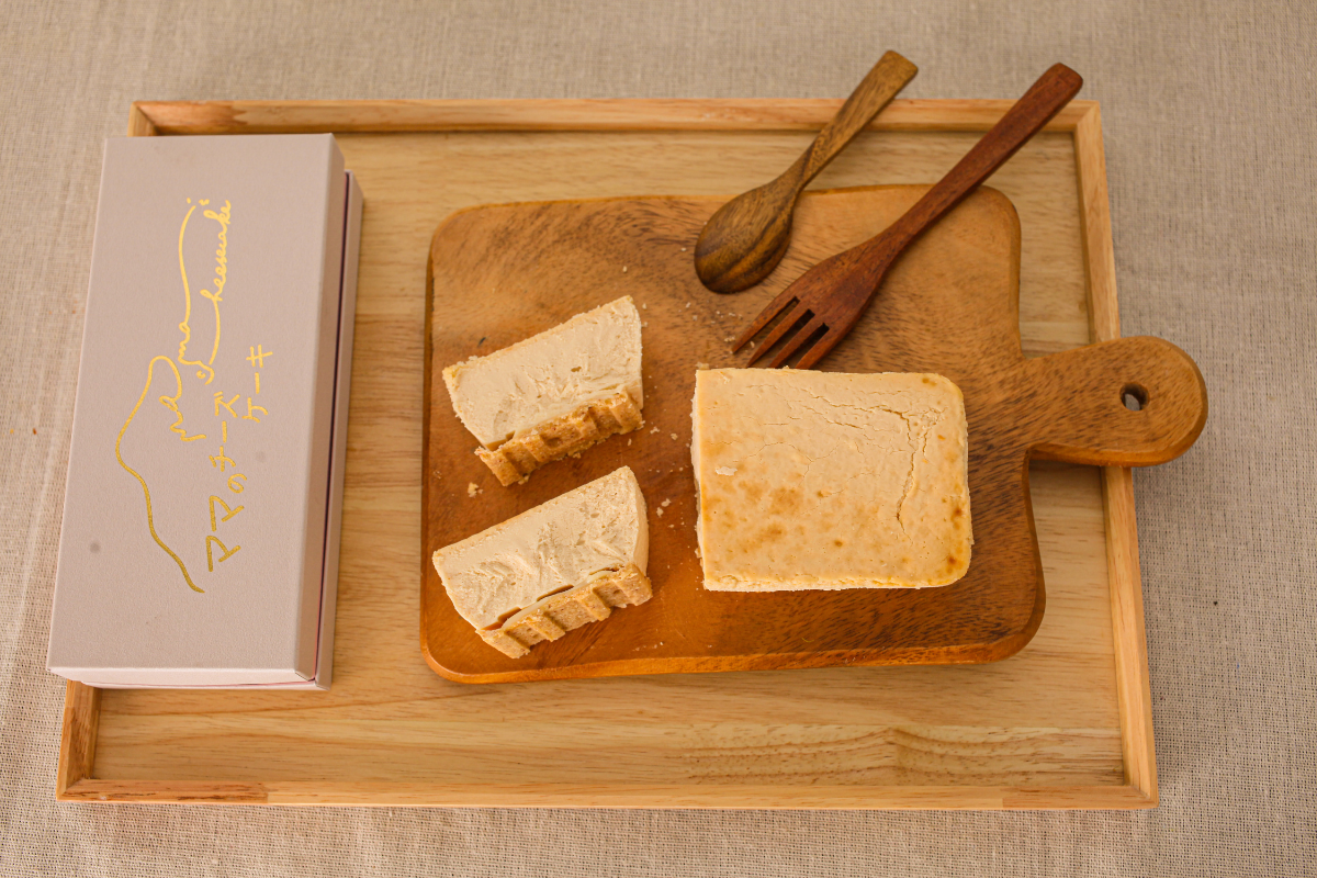 焼きあがりでは形が崩れるほどとろとろなのでヒビ割れがよくありました。そこへ富山の宝でもあるお米を使うことにすると綺麗な表面のチーズケーキが焼きあがるようになりました。